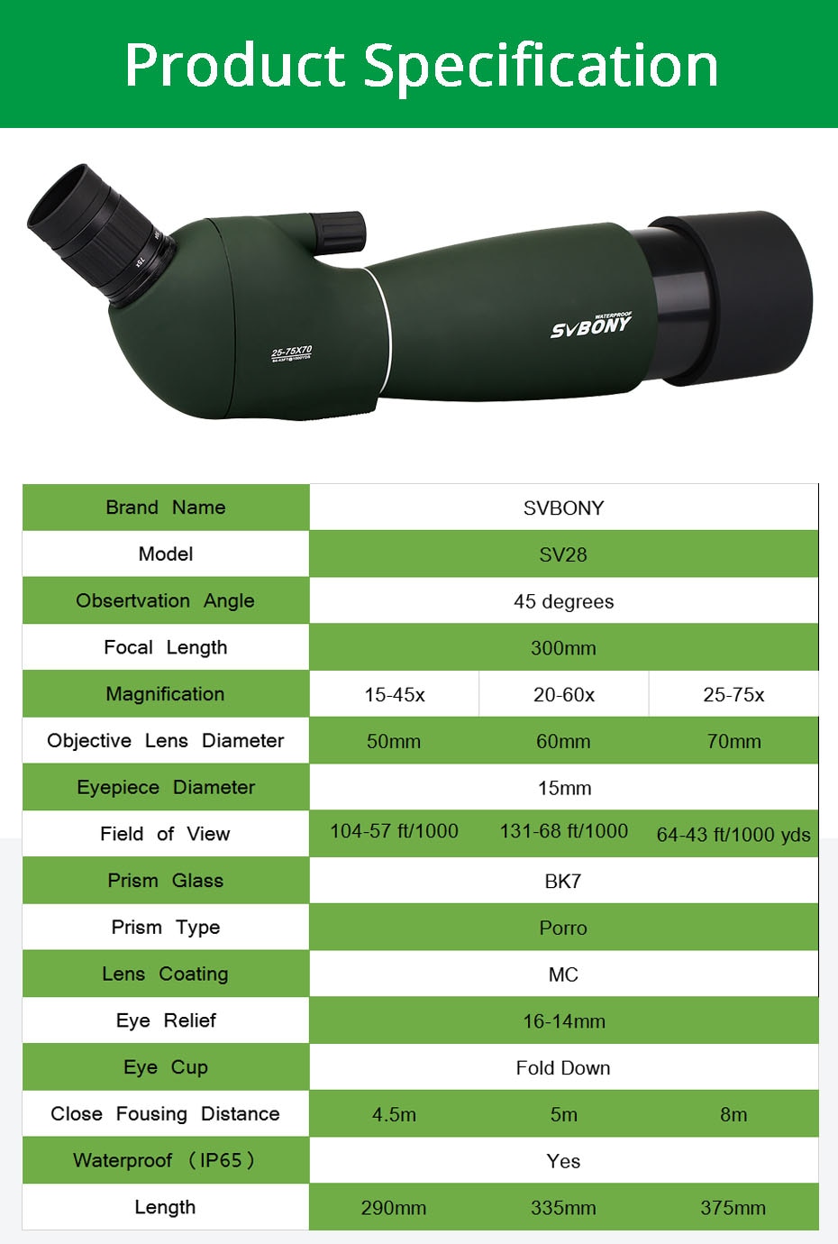 Unleash the power of observation with the SVBONY SV-28 Series Zoom Spotting Scope and experience the world in a new light.