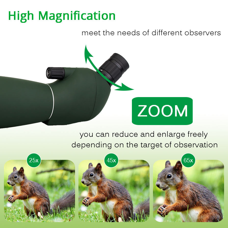 The 45-degree angled eyepiece provides a comfortable viewing angle, reducing strain during extended periods of use. Additionally, the spotting scope features an extendable sunshade, effectively reducing glare and shielding the objective lens from raindrops, enhancing your overall viewing experience.